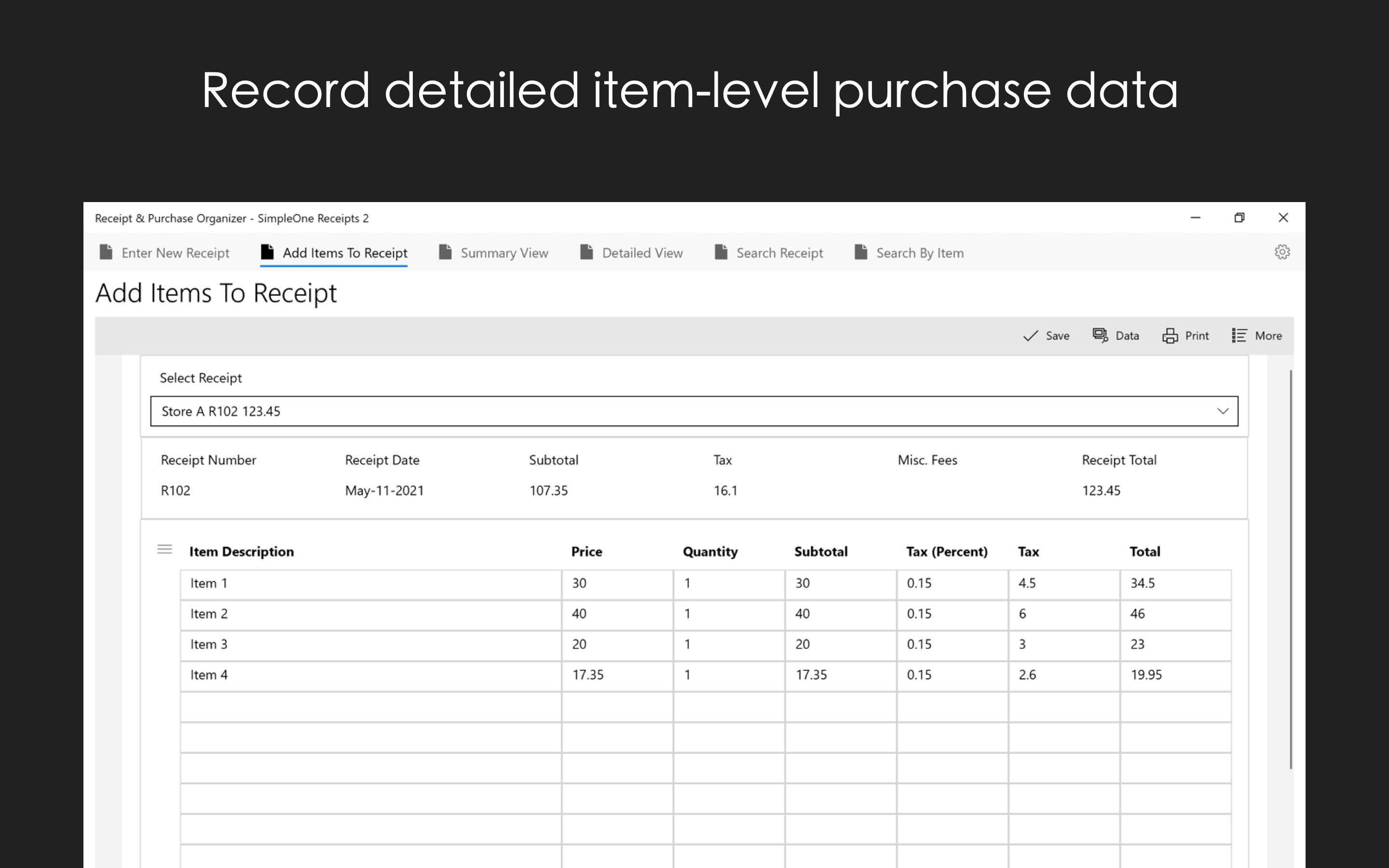 SimpleOne Receipt Organizer is a Windows App made for organizing and tracking receipt data.